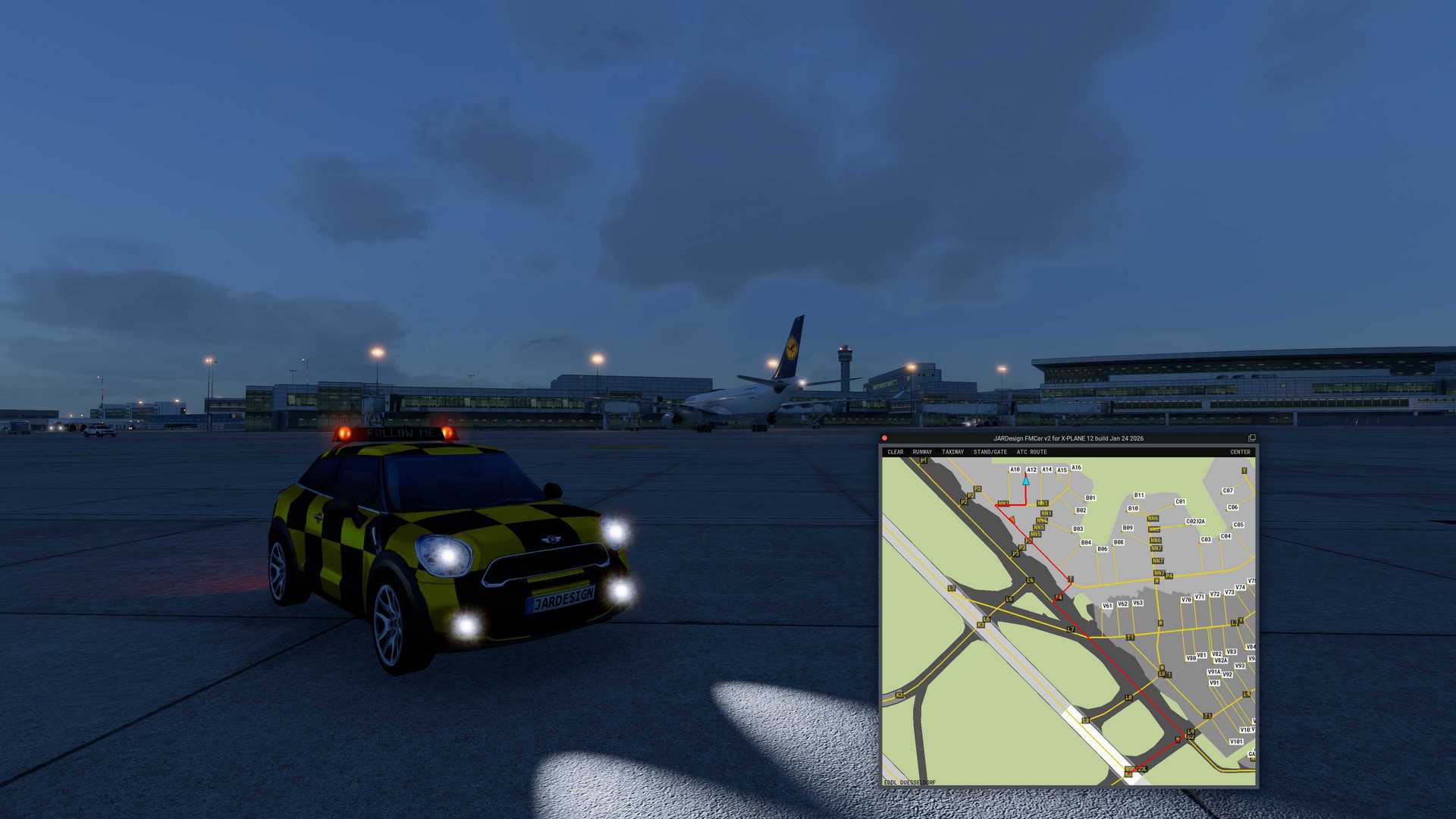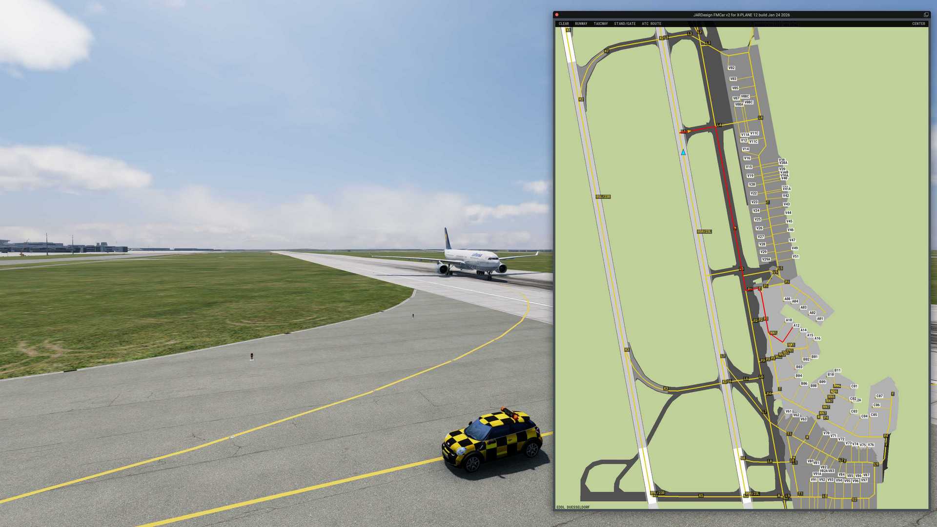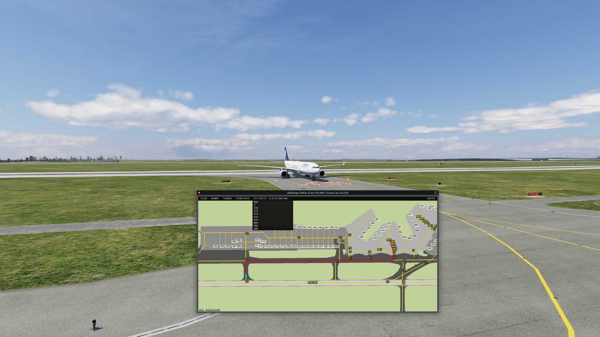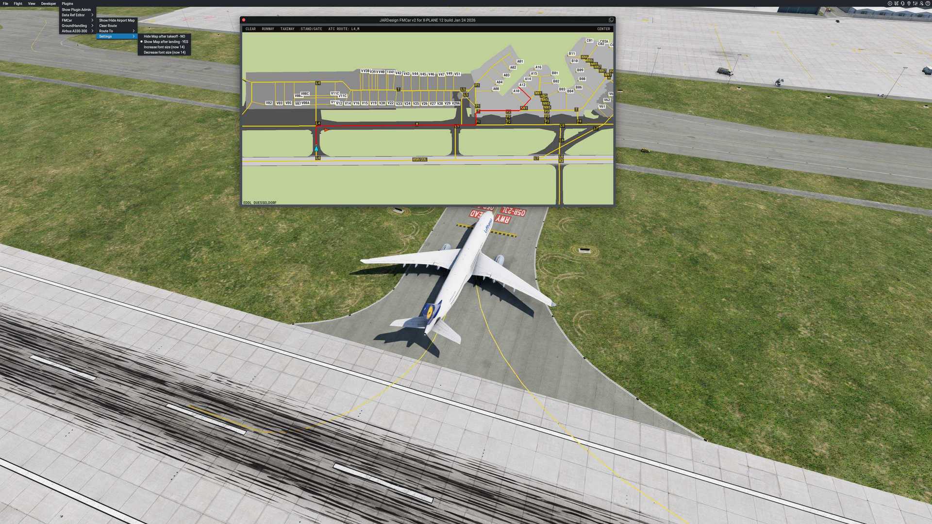 Airport / Scenery Compatibility: Any airport that contains taxiway, runway,gate, and airport surface layout data in its apt.dat file according to XPlane12 apt.dat specifications. The plugin may be unable to read airportdata if the scenery folder is located on an external drive or if any "smartlinks" are used for access.